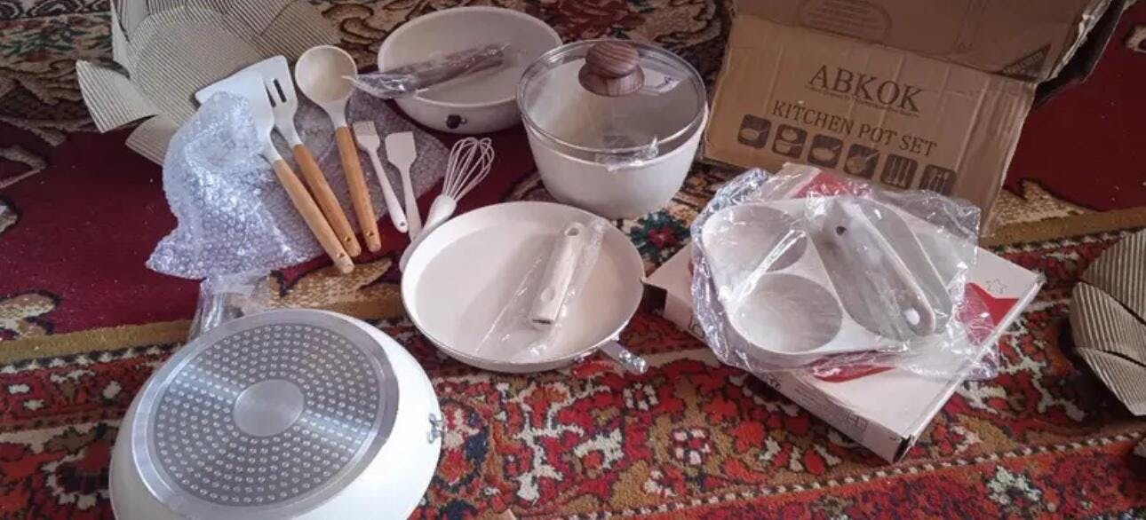 - Juego de 12 piezas con sartén, olla con tapa y utensilios de silicona